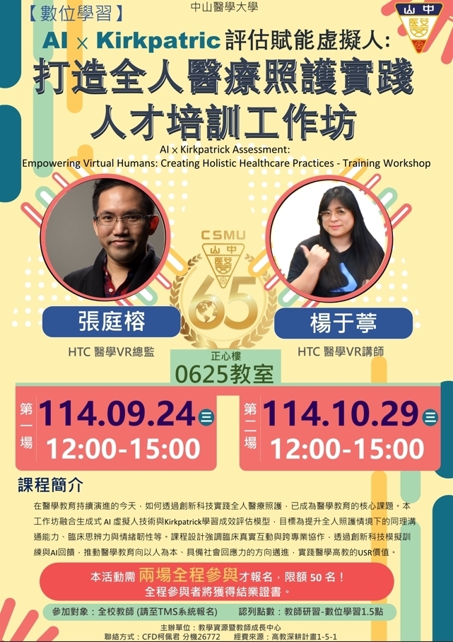 114.10.29【數位學習】AI x Kirkpatric評估賦能虚擬人:打造全人醫療照護實踐人才培訓工作坊
