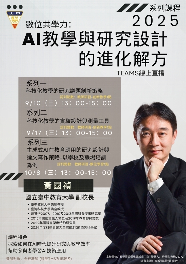 114.10.08【系列課程三】數位共學力:AI教學與研究設計的進化解方(TEAMS直播)-生成式AI在教育應用的研究設計與論文寫作策略-以學校及職場培訓為例