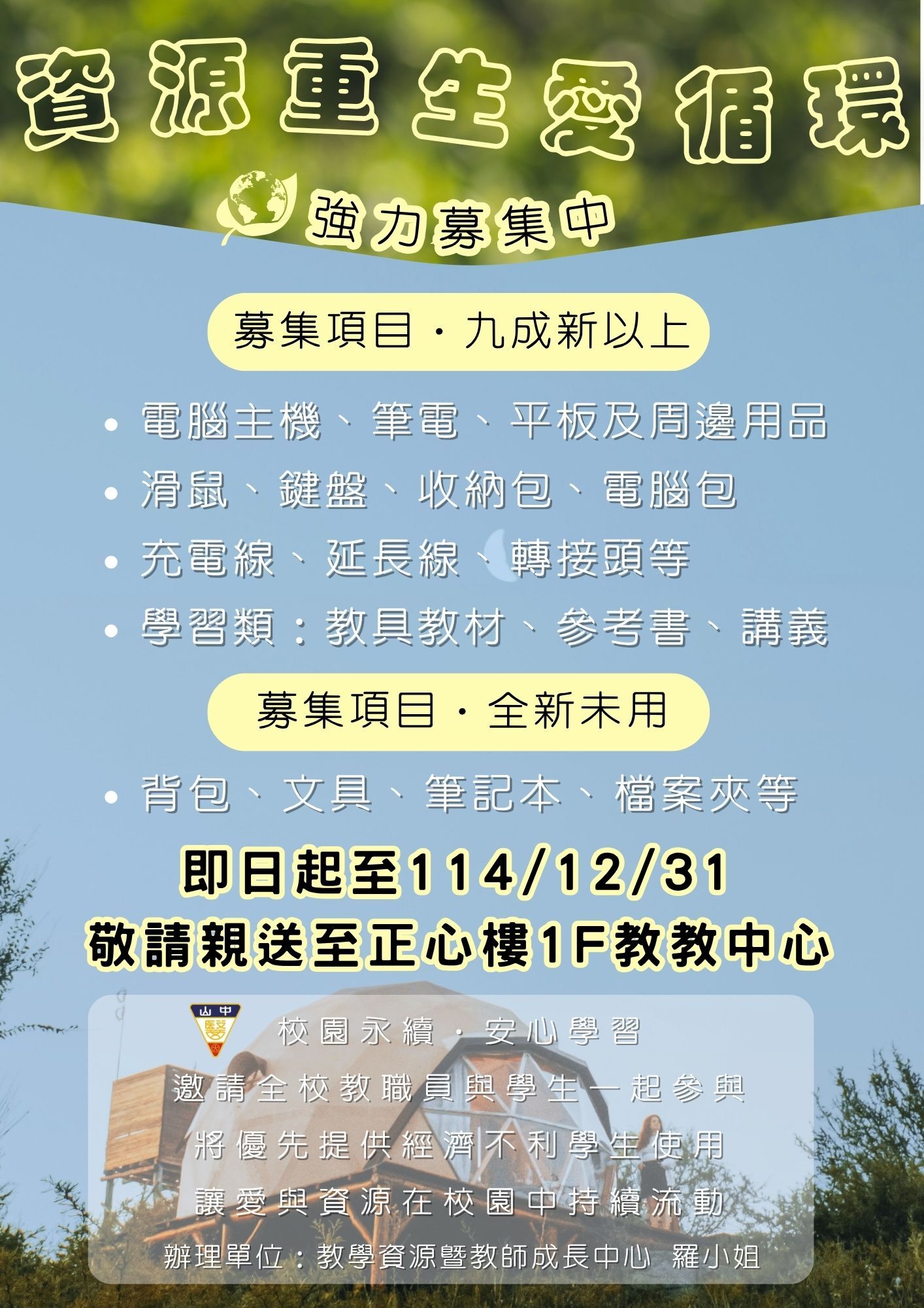 「資源重生愛循環」強力募集3C類及學習用品,邀請全校師生一起參與!