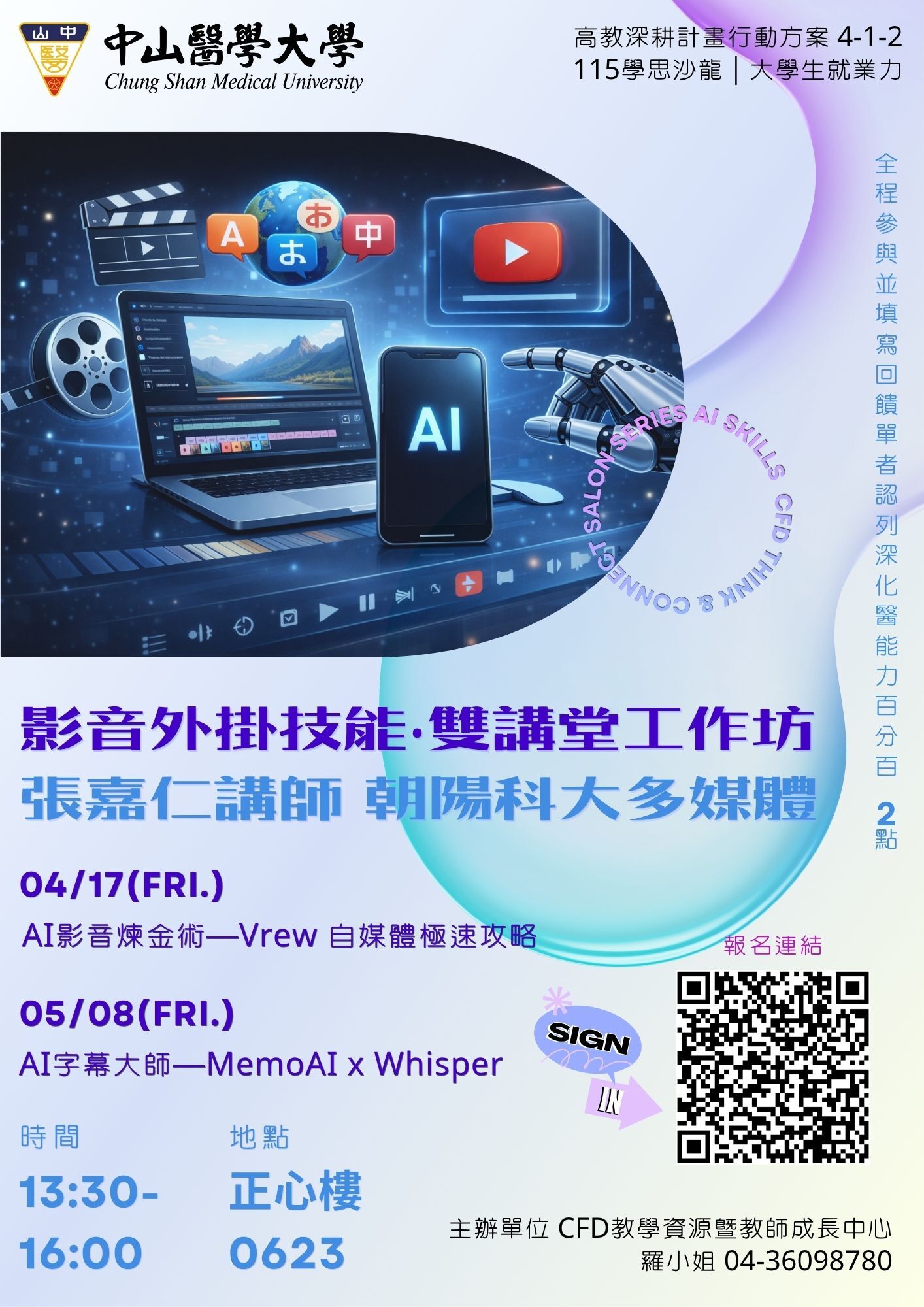 【活動消息】學思沙龍AI影音外掛技能工作坊報名資訊(115/4/17、5/8)