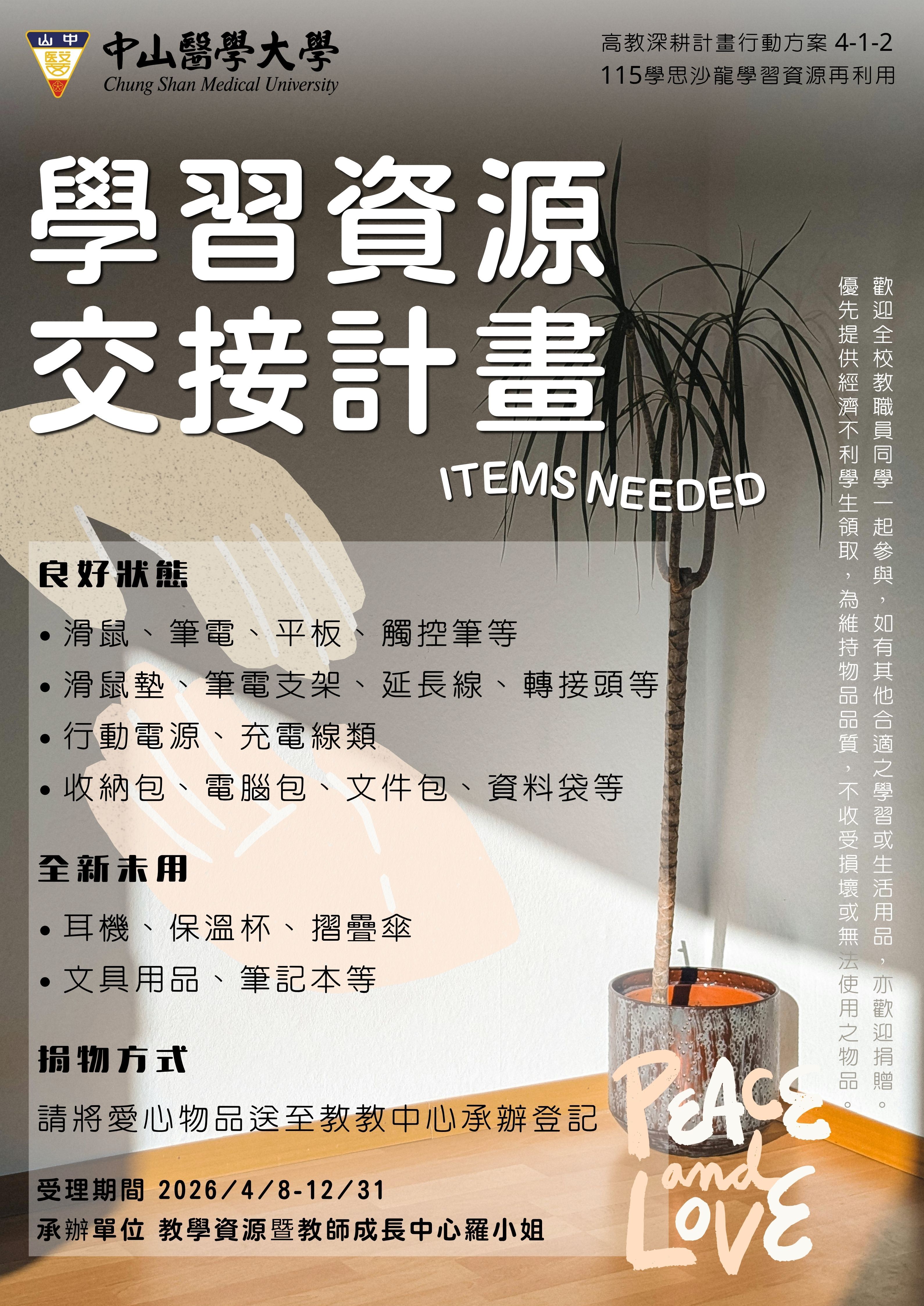 為促進校園資源共享與有效運用,推動「學習資源交接計畫」,歡迎全校教職員生一同參與。