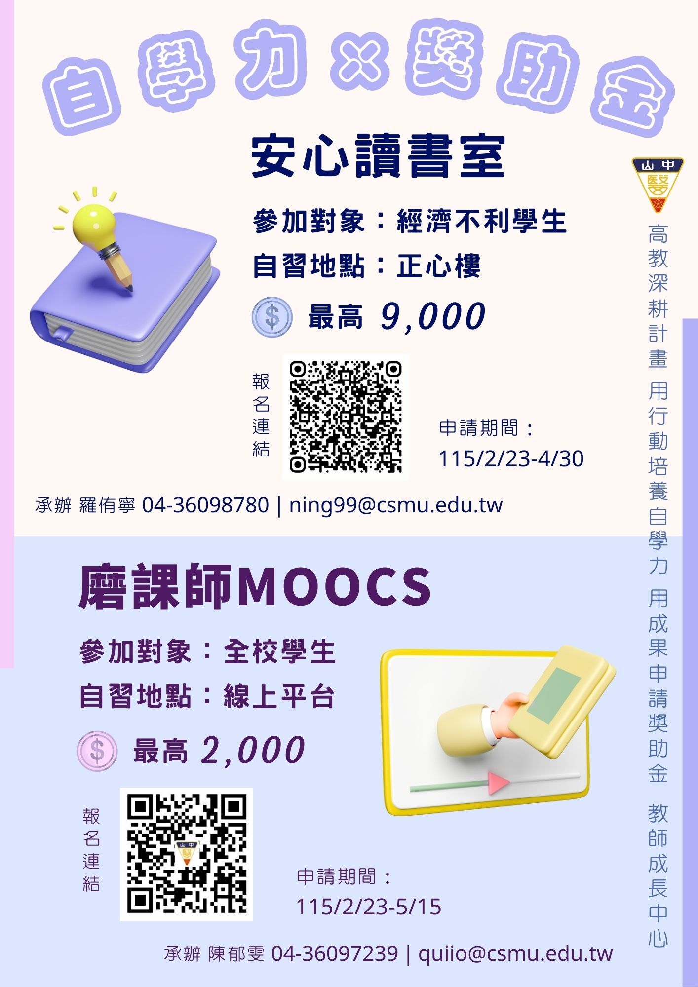 為鼓勵學生培養自主學習習慣並善用學習資源,提供安心讀書室及磨課師(MOOCs)課程學習獎助金,歡迎符合資格之學生提出申請。